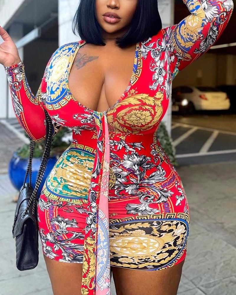 Style:Sexy,Vintage Type:Bodycon Material:97%Polyester,3%Spandex Neckline:Plunge Sleeve Style:Long Sleeve Length:Mini Pattern Type:Baroque Decoration:Others Fit Type:Skinny Occasion:Daily Package Include:1* Dress Fabric Elasticity:Non-Stretch Sheer:No Care Instructions:Machine wash or professional dry clean