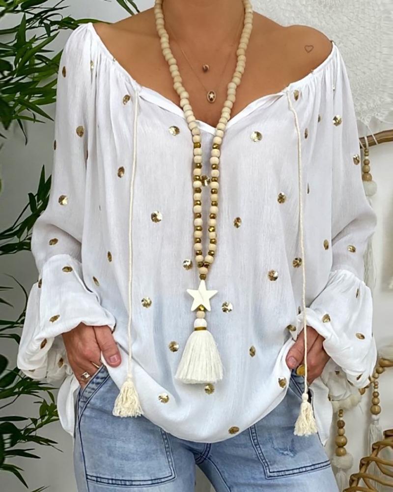 Featuring a tassel,lantern sleeve and loose fit design.