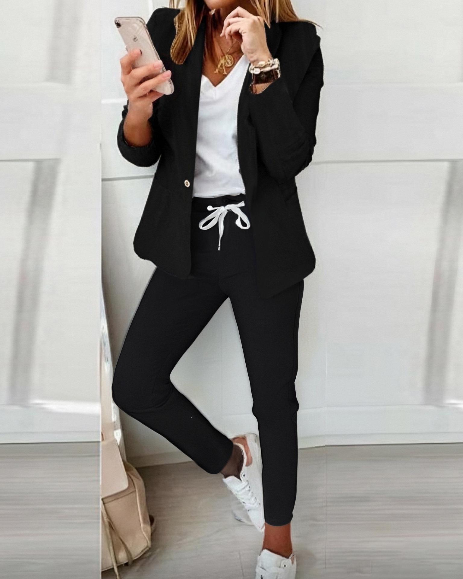 Style:Elegant Type:Blazer Sets Material:95%Polyester,5%Elastane Neckline:Shawl Collar Sleeve Style:Long Sleeve Length:Long Pattern Type:Plain Decoration:Drawstring Fit Type:Regular Occasion:Work Package Include:Pants Set Fabric Elasticity:Medium Stretch Sheer:No Care Instructions:Machine wash or professional dry clean
