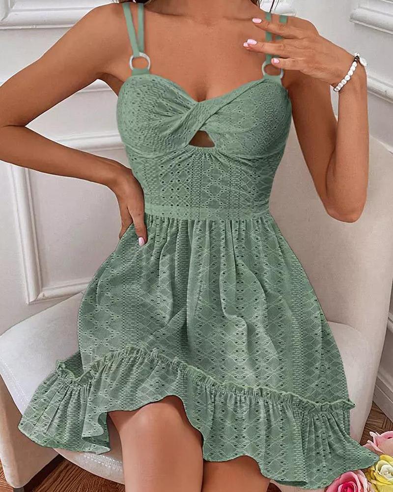 Style:Casual Type:A Line Material:97%Polyester,3%Spandex Neckline:V-Neck Sleeve Style:Sleeveless Length:Mini Pattern Type:Plain Decoration:Ruffles,Twist,Cutout,Frill Hem,Eyelet Embroidery Fit Type:Regular Occasion:Daily Package Include:1* Dress Fabric Elasticity:Slight Stretch Hem Shaped:Flounce Sheer:No Care Instructions:Machine wash or professional dry clean