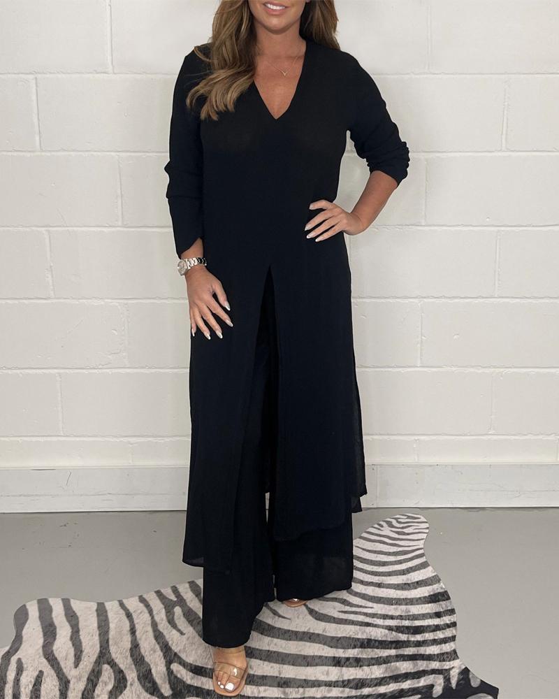 Style:Casual Type:Pants Sets Material:Polyester Neckline:V-Neck Sleeve Style:Long Sleeve Length:Long Pattern Type:Plain Decoration:Slit Fit Type:Regular Occasion:Daily Package Include:1*Pants Set Fabric Elasticity:Slight Stretch Sheer:No Care Instructions:Machine wash or professional dry clean