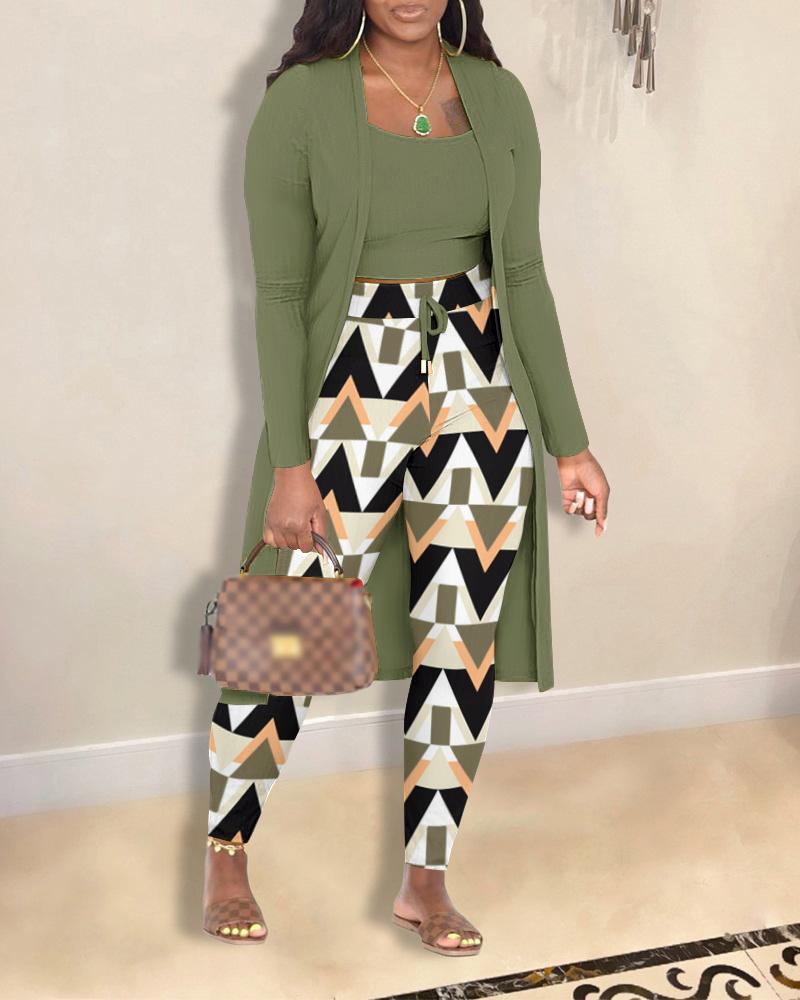 3PCS Cami Top & Geometric Print Pants Set With Longline Coat