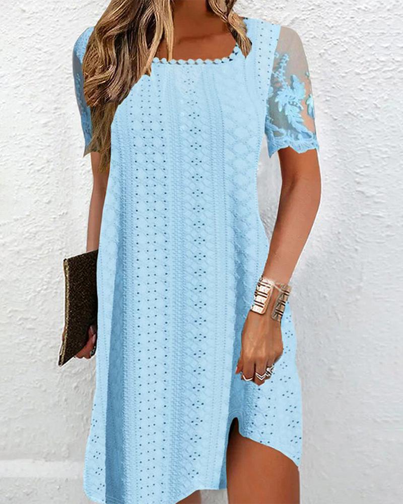 Style:Chic Type:A Line Material:97%Polyester,3%Spandex Neckline:Square Neck Sleeve Style:Short Sleeve Length:Mini Pattern Type:Plain Decoration:Contrast Lace,Eyelet Embroidery Fit Type:Regular Occasion:Daily Package Include:1* Dress Fabric Elasticity:Slight Stretch Sheer:No Care Instructions:Machine wash or professional dry clean