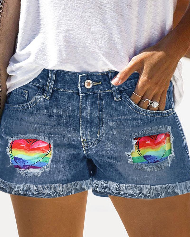 Melting Colors Print Patchwork Ripped Denim Shorts