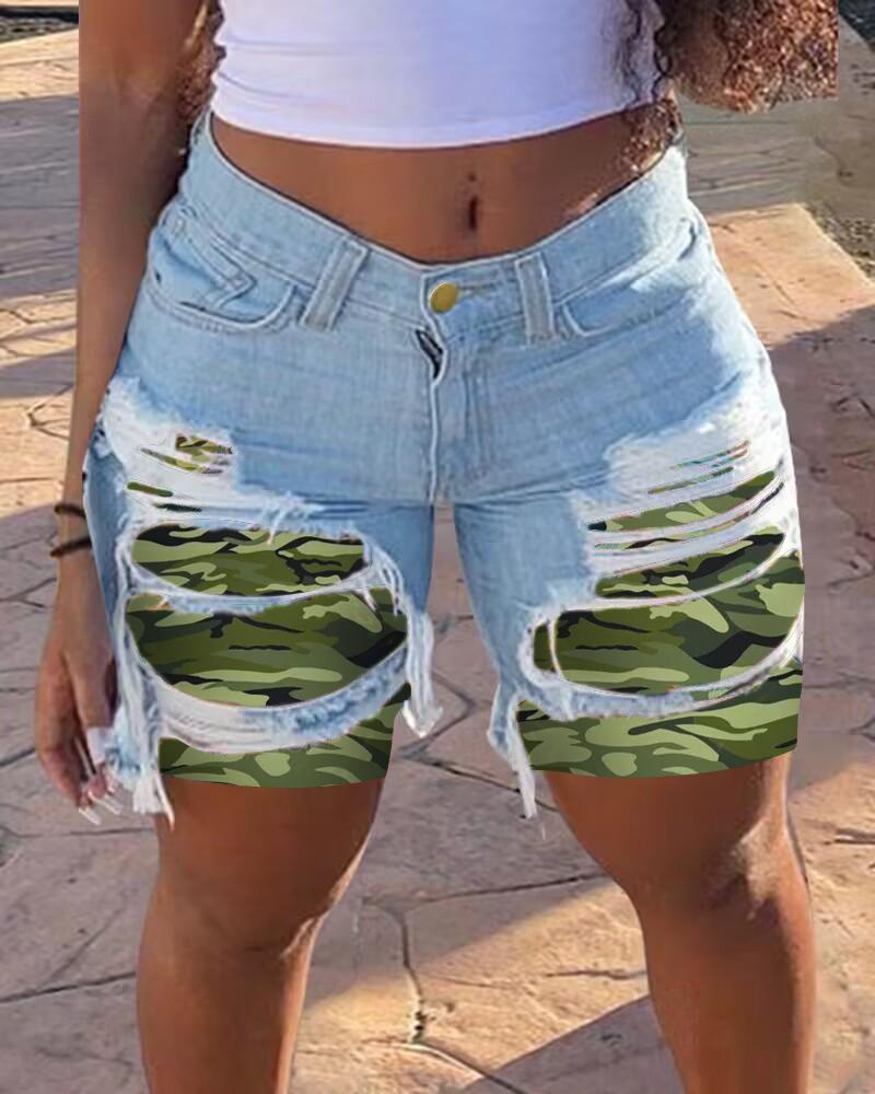 Melting Colors Print Patchwork Ripped Denim Shorts