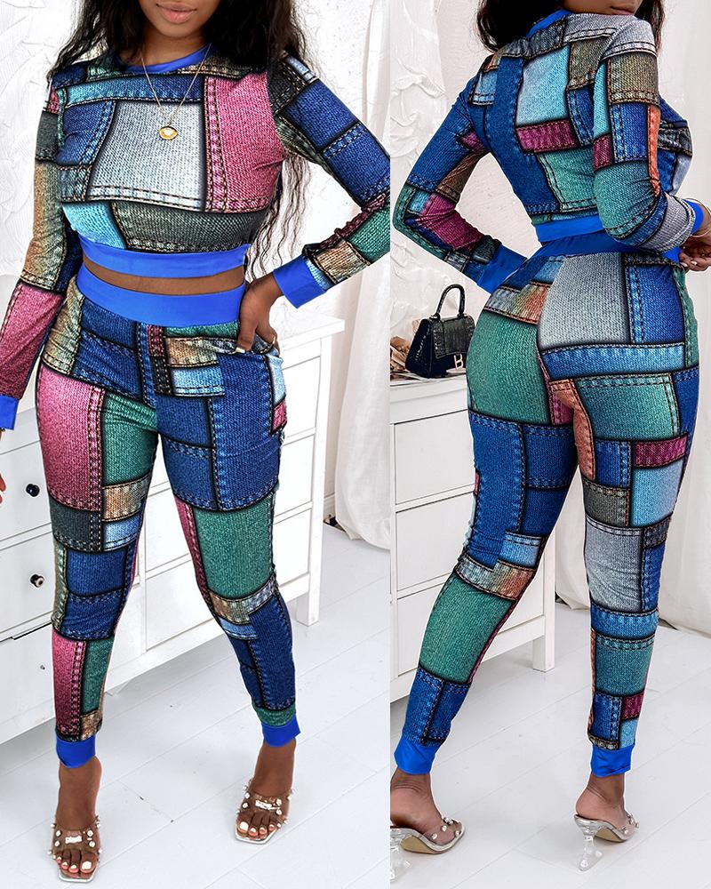 Denim Look Print Long Sleeve Crop Top & Pants Set
