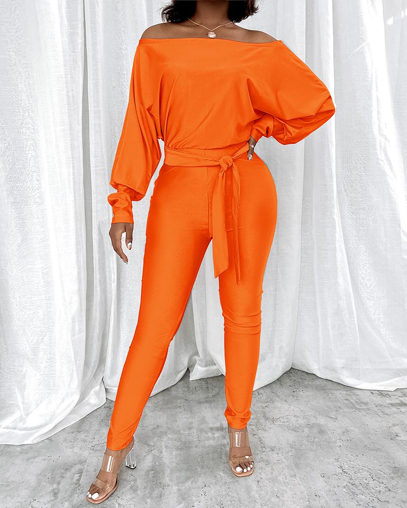 Style:Chic,Sexy Type:Jumpsuit Material:95%Polyester,5%Elastane Neckline:Off the Shoulder Sleeve Style:Batwing Sleeve,Lantern Sleeve,Long Sleeve Length:Long Pattern Type:Plain Decoration:Batwing Sleeve,Lantern Sleeve Fit Type:Skinny With Belt:Yes Occasion:Night Out,Party Package Include:1*Jumpsuit(With Belt) Fabric Elasticity:Non-Stretch