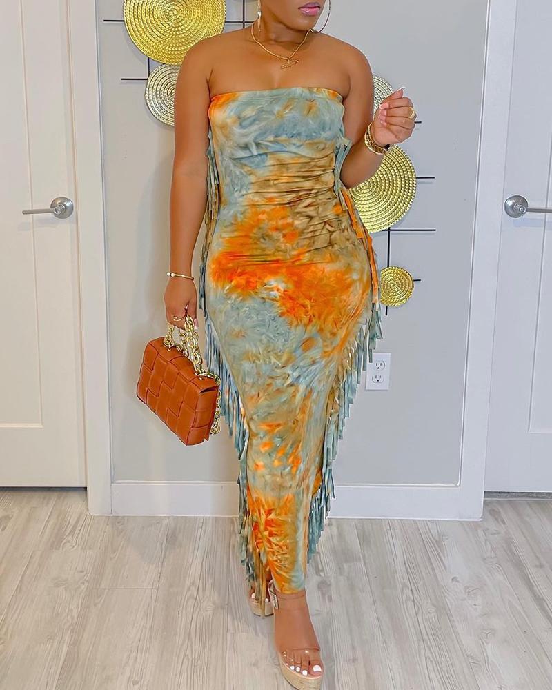 Style:Chic Type:Bodycon Material:97%Polyester,3%Spandex Neckline:Bandeau Sleeve Style:Sleeveless Length:Maxi Pattern Type:Tie Dye Decoration:Tassel Fit Type:Skinny Occasion:Daily Package Include:1* Dress Fabric Elasticity:Non-Stretch Sheer:No Care Instructions:Machine wash or professional dry clean Waist Line:Natural