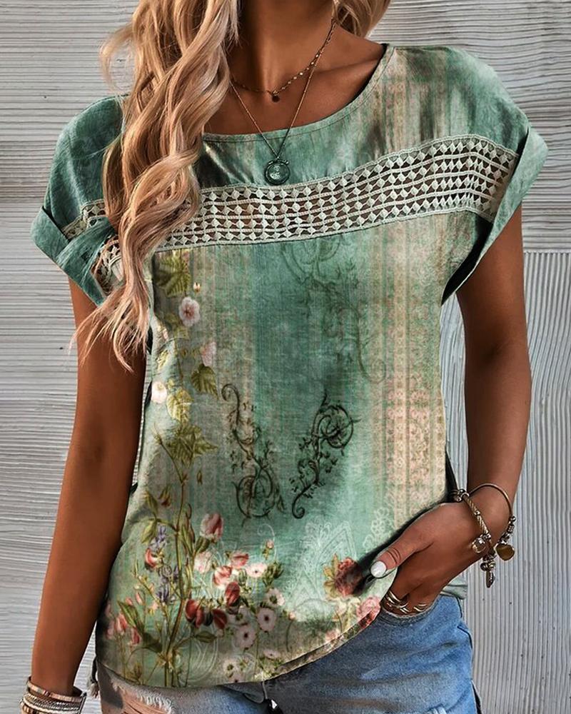 Style:Chic Type:Tee Material:100%Polyester Neckline:Round Neck Sleeve Style:Short Sleeve Length:Regular Pattern Type:Tribal Decoration:Contrast Lace Fit Type:Regular Occasion:Daily Package Include:1*T-Shirt Fabric Elasticity:Slight Stretch Sheer:No Care Instructions:Machine wash or professional dry clean