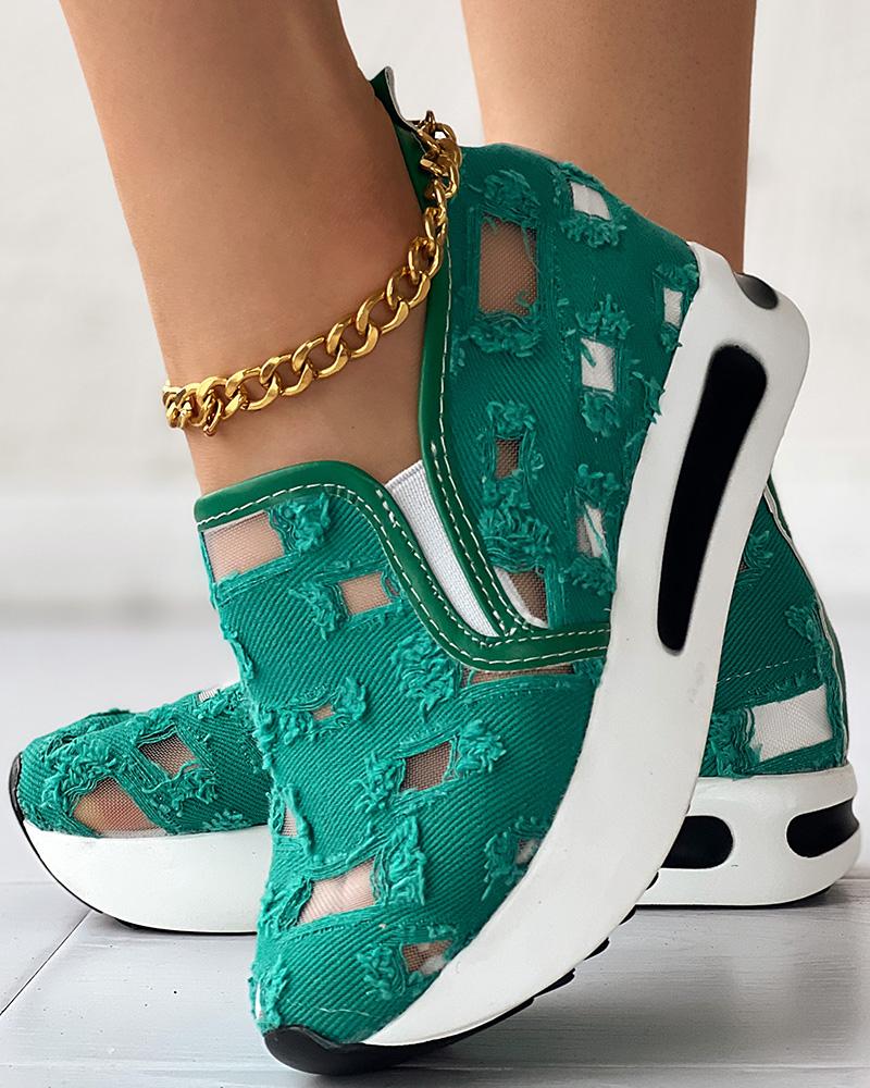 Mesh Patch Denim Raw Hem Muffin Sneakers