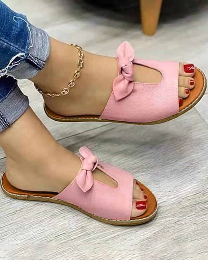 Style:Chic Type:Slippers Material:PU Pattern Type:Plain Decoration:Bowknot,Hollow-out Occasion:Daily Toe:Open Toe,Round Toe Heel Height:Flat Package Include:1*Slippers