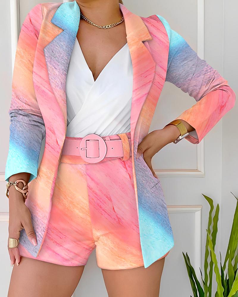 Tie Dye Print Ombre Blazer Coat & Shorts Set With Belt