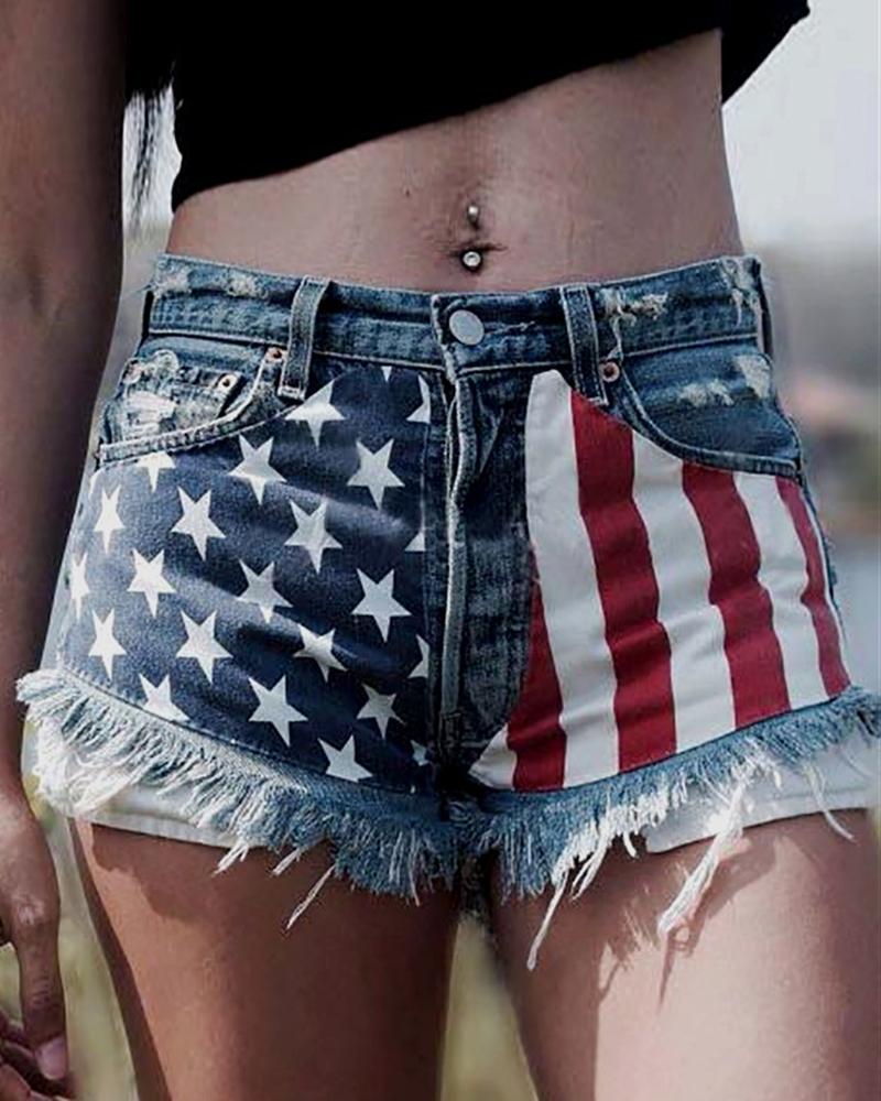 Independence Day Flag Print Patchwork Buttoned Denim Shorts