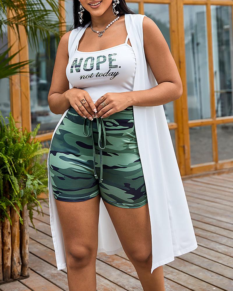 3PCS Nope Not Today Camo Print Crop Top & Shorts Set With Vest Coat