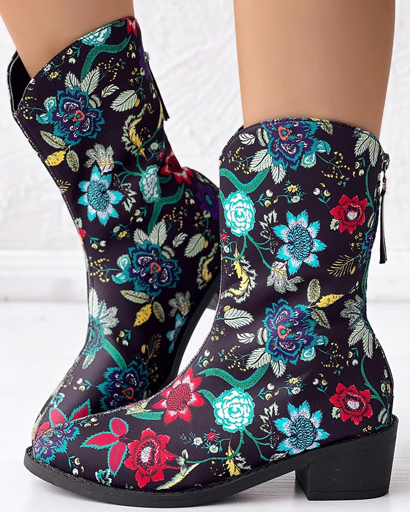Vintage Floral Pattern Zipper Back Ankle Boots