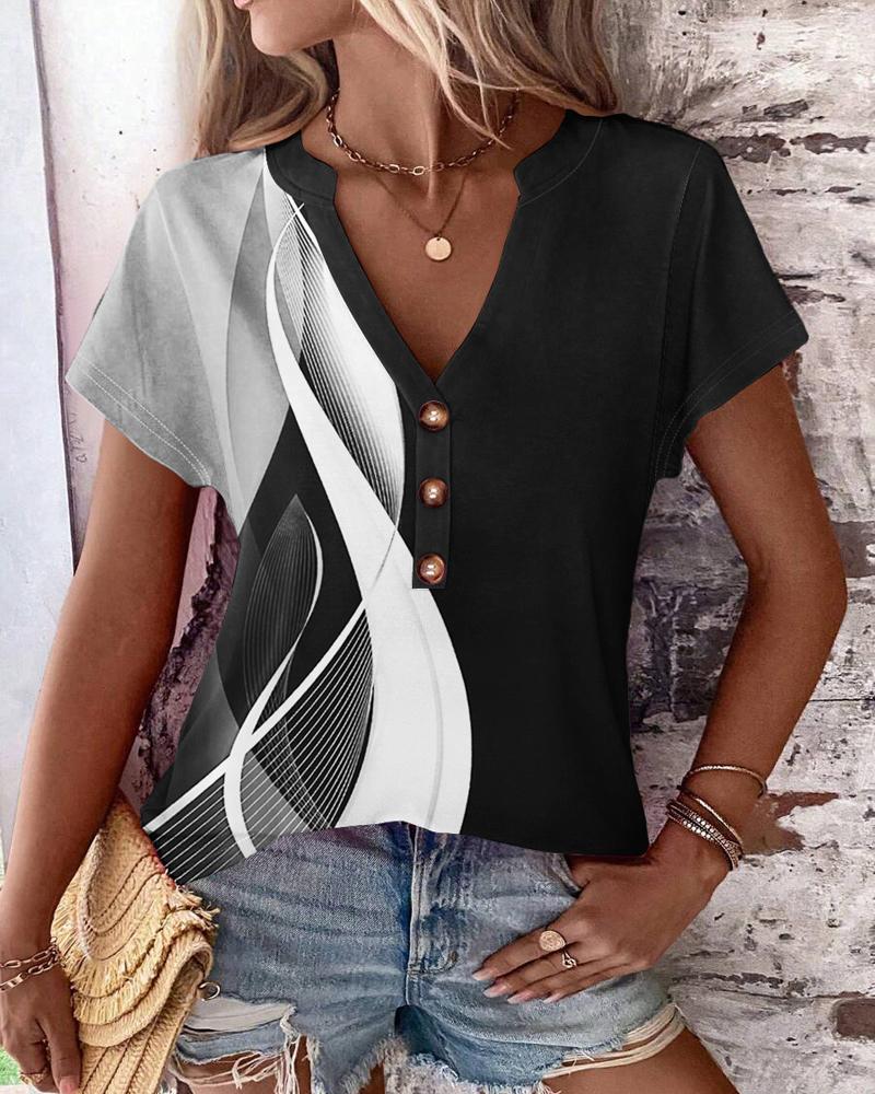 Abstract Print Colorblock Buttoned Casual T-shirt
