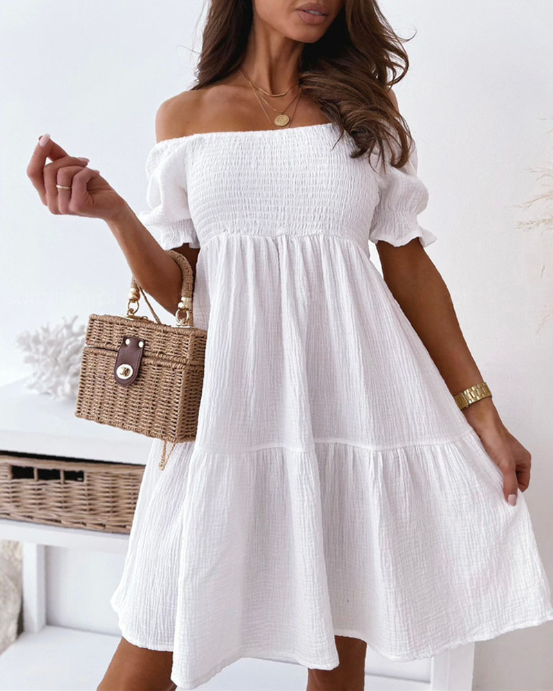 Style:Casual,Chic Type:A Line Material:Polyester Neckline:Off the Shoulder Sleeve Style:Short Sleeve Length:Mini Pattern Type:Plain Decoration:Frill Hem,Shirred Fit Type:Regular Occasion:Daily,Vacation Package Include:1* Dress