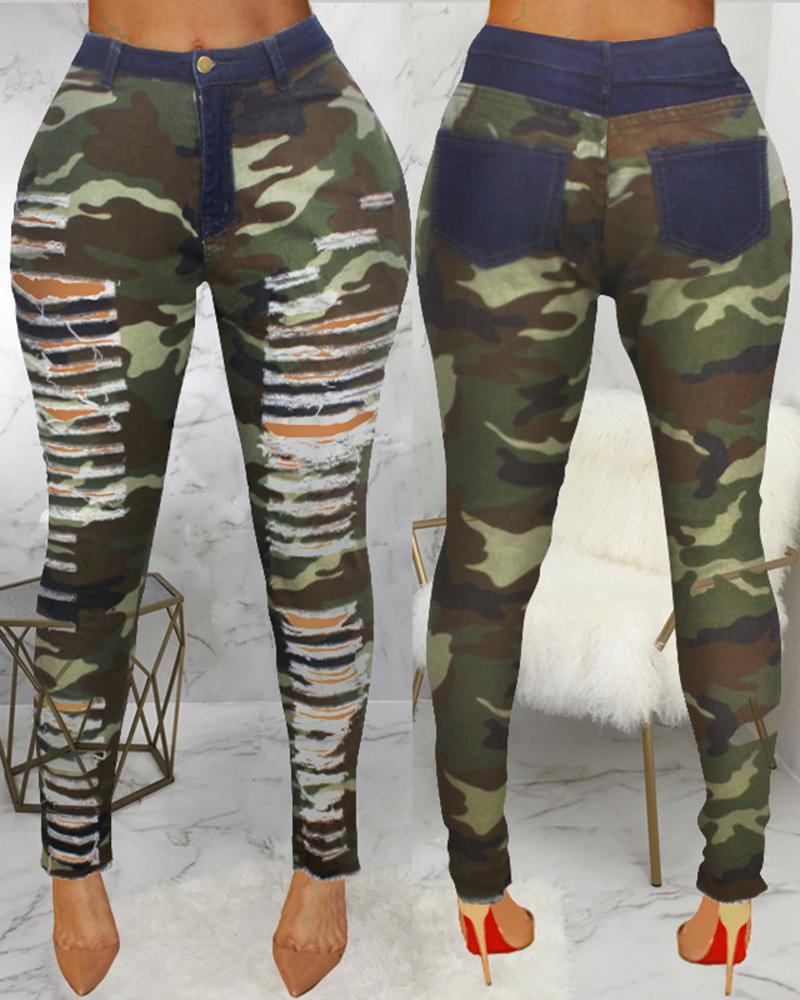 Camouflage Print Ripped Cutout Fringe Hem Jeans