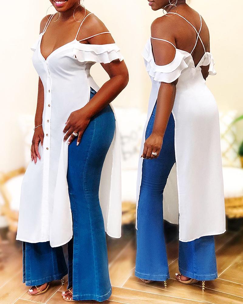 Style:Chic,Sexy Type:Blouses Material:96%Polyester,4%Elastane Neckline:Cold Shoulder Sleeve Style:Short Sleeve Length:Long Pattern Type:Plain Decoration:Backless,Button,Criss Cross,Ruffles,Slit Fit Type:Regular Occasion:Daily Package Include:1* Blouse Fabric Elasticity:Slight Stretch