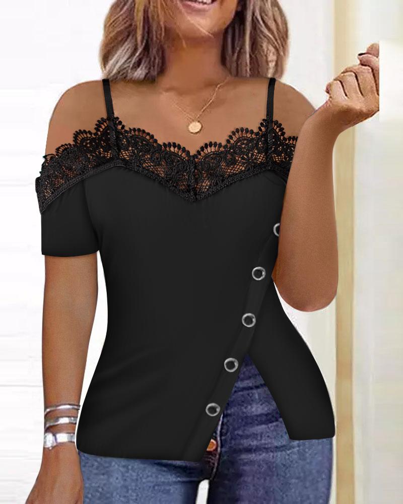 Style:Casual Type:Tee Material:97%Polyester,3%Spandex Neckline:Cold Shoulder Sleeve Style:Short Sleeve Length:Regular Pattern Type:Plain Decoration:Contrast Lace,Button Fit Type:Regular Occasion:Daily Package Include:1*Top Fabric Elasticity:Slight Stretch
