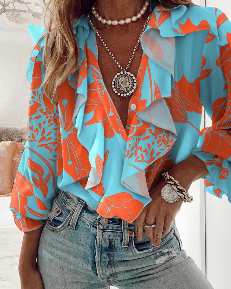 Style:Casual Type:Blouses Material:100%Polyester Neckline:V-Neck Sleeve Style:Long Sleeve Length:Regular Pattern Type:Plants Decoration:Button,Ruffles Fit Type:Regular Occasion:Daily Package Include:1* Blouse Fabric Elasticity:Slight Stretch
