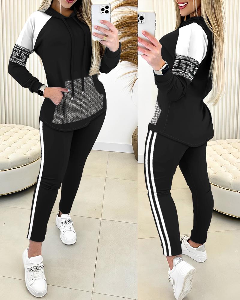 Rhinestone Geometric Pattern Colorblock Hooded Top & Striped Pants Set