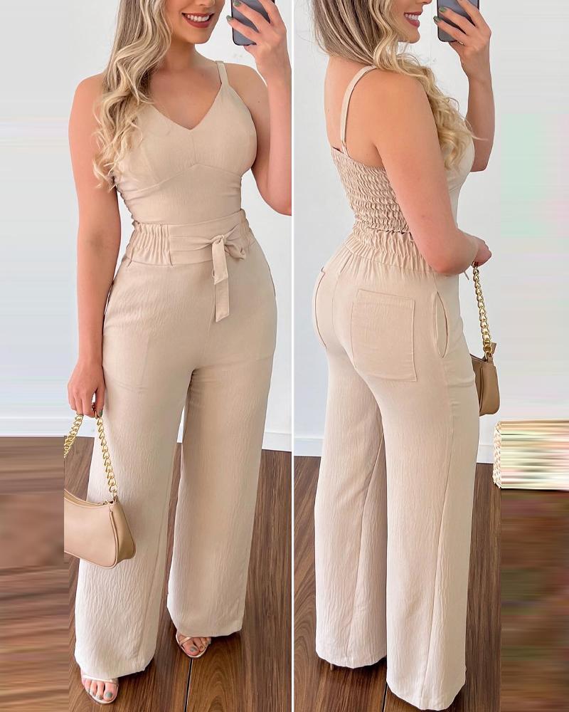Style:Casual Type:Pants Sets Material:97%Polyester,3%Elastane Neckline:V-Neck Sleeve Style:Spaghetti Strap Length:Long Pattern Type:Plain Decoration:Pocket,Shirred,Tied Detail Fit Type:Regular Occasion:Daily Package Include:1*Pants Set Fabric Elasticity:Slight Stretch Sheer:No Care Instructions:Machine wash or professional dry clean