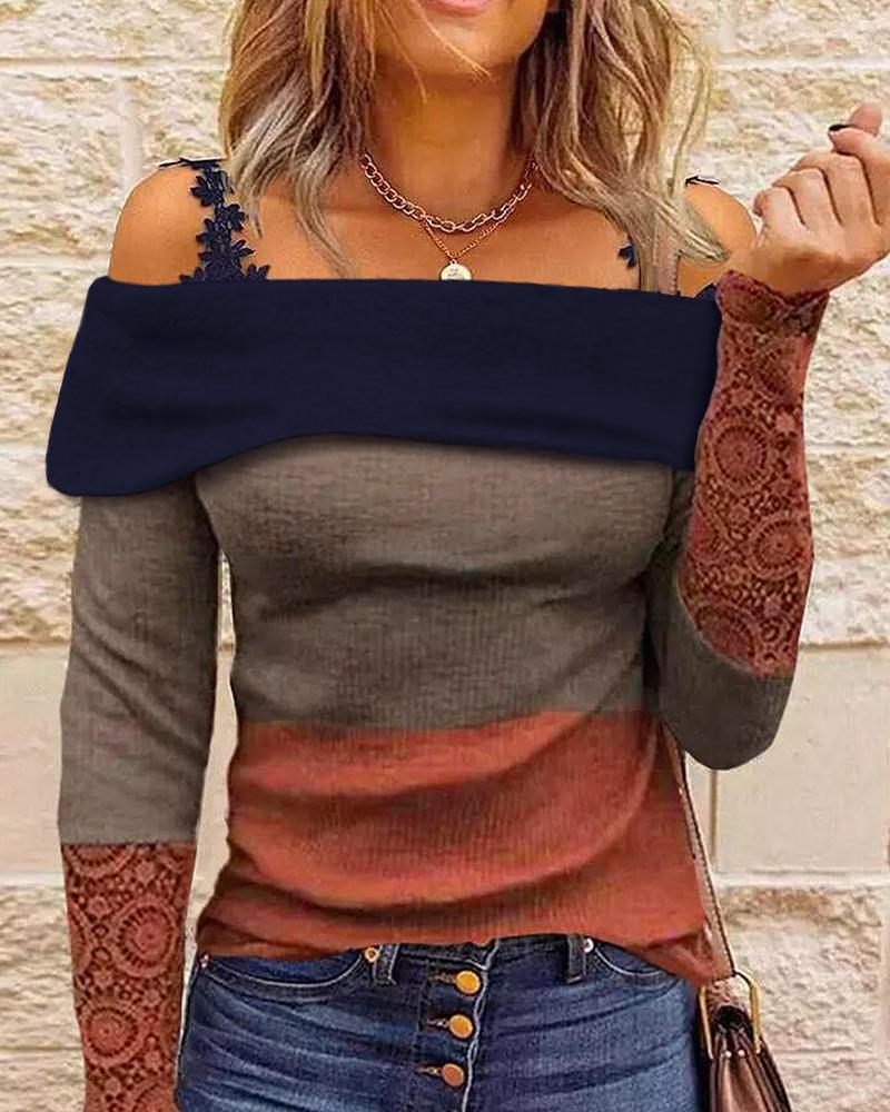 Style:Casual Type:Tee Material:97%Polyester,3%Spandex Neckline:Cold Shoulder Sleeve Style:Long Sleeve Length:Regular Pattern Type:Colorblock Decoration:Contrast Lace Fit Type:Regular Occasion:Daily Package Include:1*Top