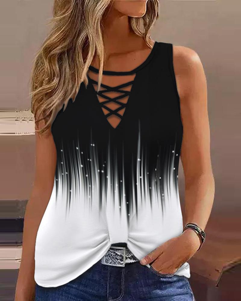 Style:Casual Type:Tank Material:97%Polyester,3%Spandex Neckline:V-Neck Sleeve Style:Sleeveless Length:Regular Pattern Type:Abstract,Colorblock Decoration:Criss Cross,Cutout Fit Type:Regular Occasion:Daily Package Include:1*Top Fabric Elasticity:Slight Stretch Sheer:No Care Instructions:Machine wash or professional dry clean