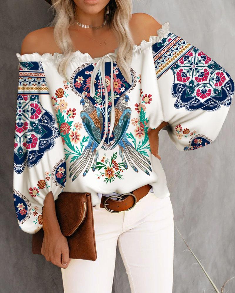Style:Casual,Vintage Type:Blouses Material:100%Polyester Neckline:Off the Shoulder Sleeve Style:Lantern Sleeve,Long Sleeve Length:Regular Pattern Type:Animal,Floral,Tribal Decoration:Frill Hem,Lantern Sleeve,Tied Detail Fit Type:Regular Occasion:Daily,Vacation Package Include:1* Blouse Fabric Elasticity:Slight Stretch Sheer:No Care Instructions:Machine wash or professional dry clean