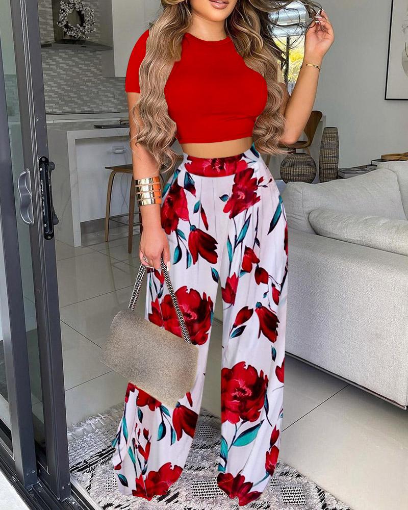 O-neck Top & Floral Print Wide Leg Pants Set
