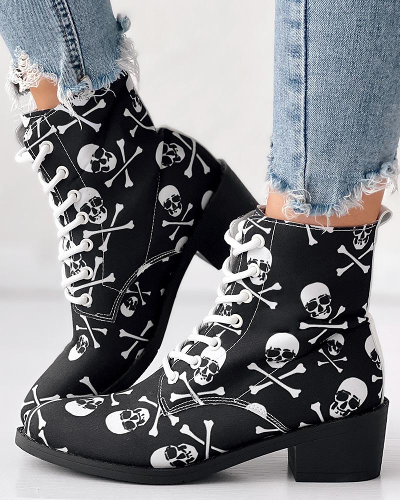 Halloween Skull Head Print Chunky Heel Ankle Boots