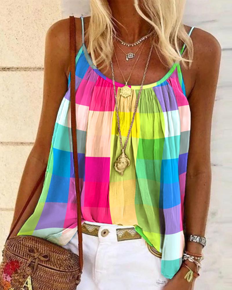 Style:Basics,Casual Type:Cami Material:97%Polyester,3%Spandex Neckline:Scoop Neck Sleeve Style:Spaghetti Strap Length:Regular Pattern Type:Plaid Decoration:Ruched Fit Type:Regular Occasion:Daily,Vacation Package Include:1*Top