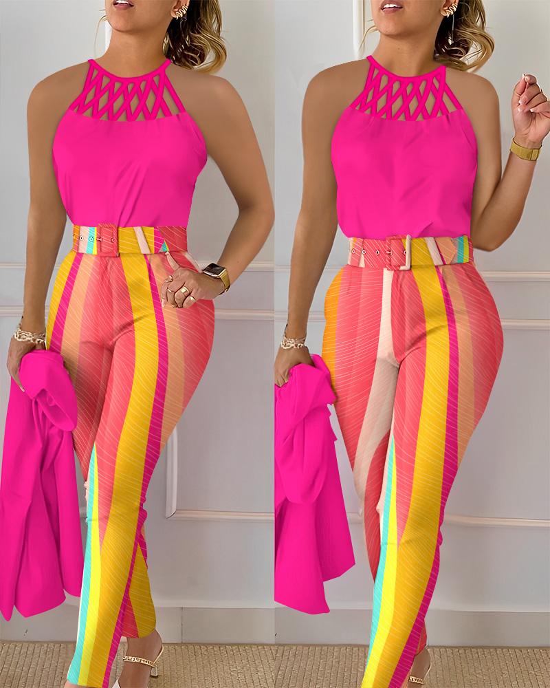 Style:Chic,Elegant Type:Pants Sets Material:97%Polyester,3%Spandex Neckline:Round Neck Sleeve Style:Sleeveless Length:Long Pattern Type:Rainbow Stripe,Colorblock Decoration:Hollow-out,Pocket Fit Type:Skinny With Belt:Yes Occasion:Daily,Work Package Include:1*Pants Set(With Belt) Fabric Elasticity:Non-Stretch Sheer:No Care Instructions:Machine wash or professional dry clean
