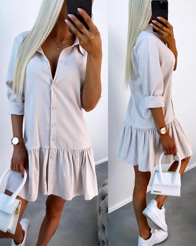 Style:Chic Type:A Line Material:100%Polyester Neckline:Turn-down Collar Sleeve Style:Long Sleeve Length:Mini Pattern Type:Plain Decoration:Button,Ruffles Fit Type:Regular Occasion:Daily Package Include:1* Dress Fabric Elasticity:Slight Stretch Sheer:No Care Instructions:Machine wash or professional dry clean