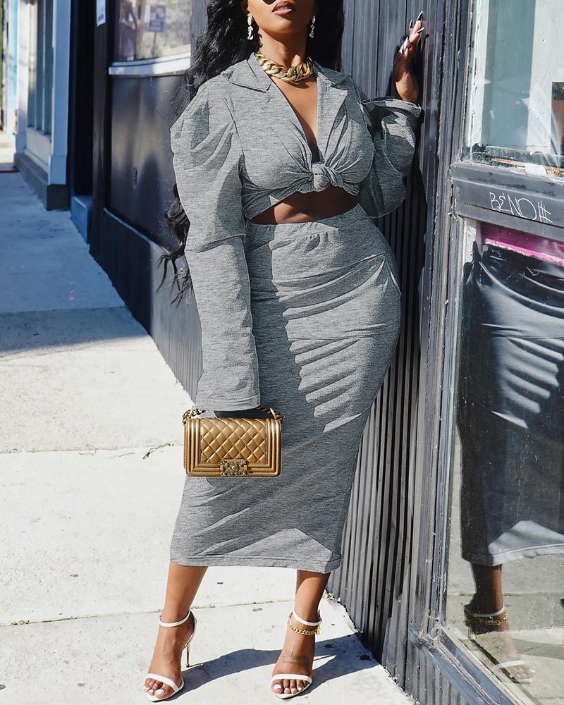 Style:Casual,Chic Type:Skirt Sets Material:Polyester Neckline:Notched Collar Sleeve Style:Long Sleeve Length:Maxi Pattern Type:Plain Decoration:Pocket,Tied Detail Fit Type:Regular Occasion:Daily Package Include:1*Skirt Set Fabric Elasticity:Slight Stretch Sleeve Type:Puff Sleeve Sheer:No Care Instructions:Machine wash or professional dry clean Waist Line:High Waist