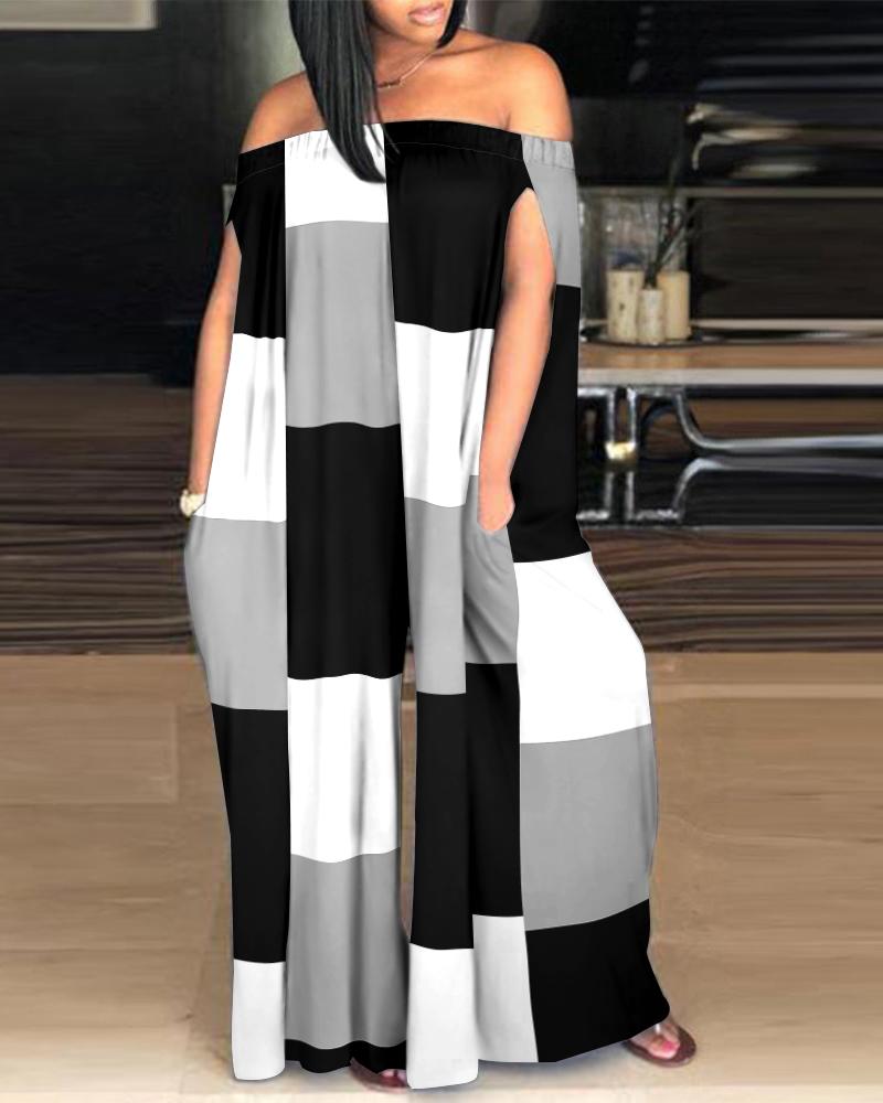 Style:Casual Type:Jumpsuit Material:100%Polyester Neckline:Off the Shoulder Sleeve Style:Short Sleeve Length:Long Pattern Type:Colorblock,Geometric Decoration:Pocket Fit Type:Oversized Occasion:Daily Package Include:1*Jumpsuit Fabric Elasticity:Slight Stretch Sheer:No Care Instructions:Machine wash or professional dry clean