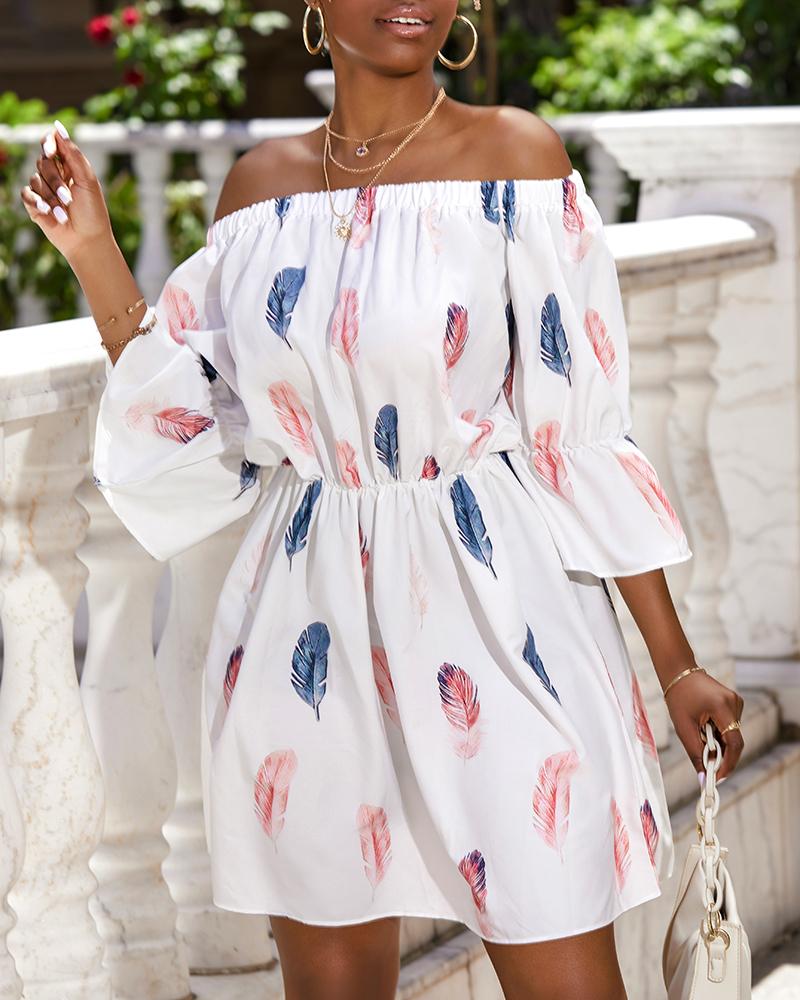 Feather Print Off Shoulder Bell Sleeve Casual Dress