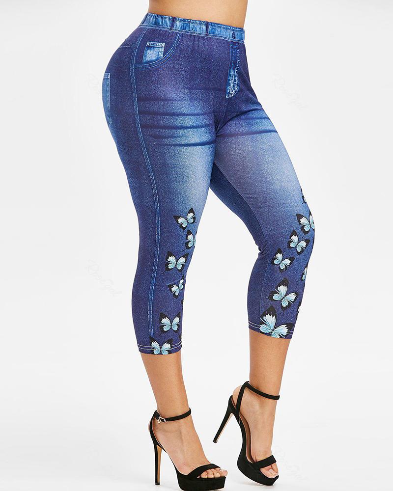 Plus Size Denim Look Butterfly Print Capris Pants
