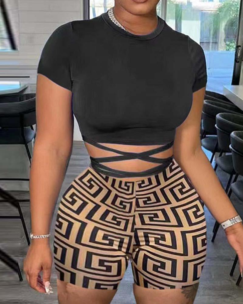 Crisscross Crop Top & Geometric Print Shorts Set