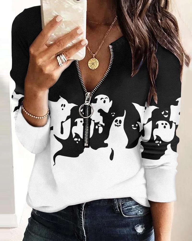 Halloween Graphic Print Zip Front Long Sleeve Top