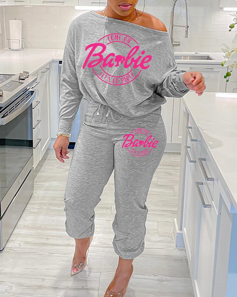 Come On Barbie Let's Go Party Print Skew Neck Top & Drawstring Cuffed Pants Set
