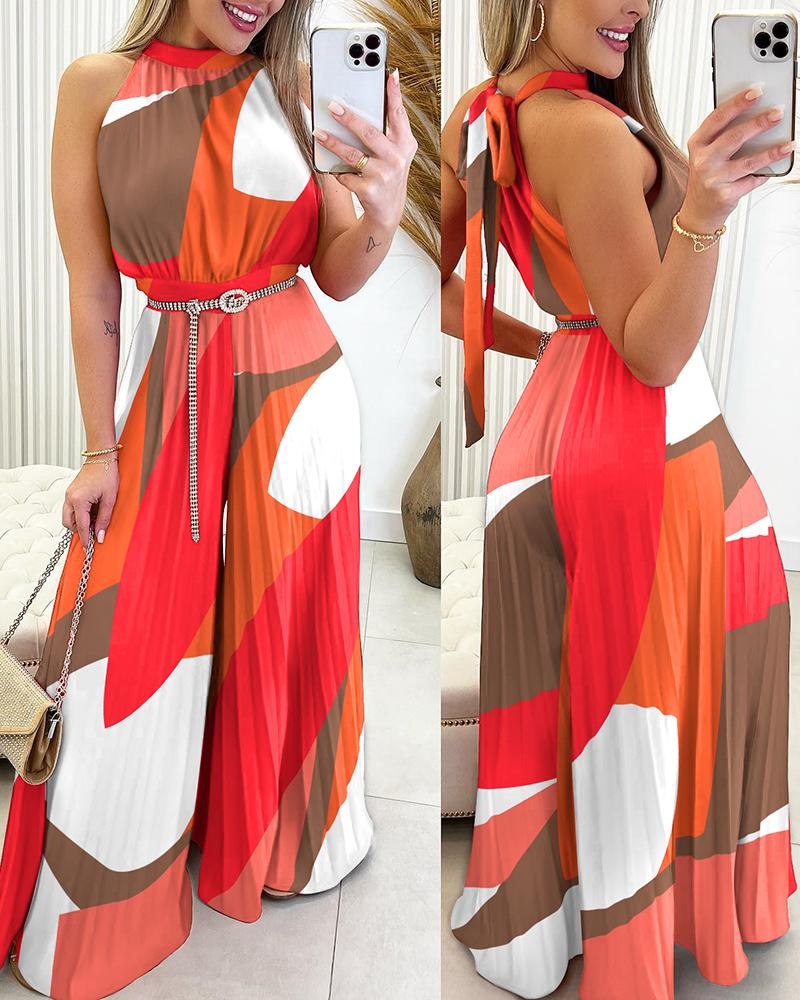 Style:Elegant,Casual Type:Jumpsuit Material:100%Polyester Neckline:Halter Sleeve Style:Sleeveless Length:Long Pattern Type:Geometric Decoration:Tied Detail Fit Type:Regular With Belt:No Occasion:Daily,Work Package Include:1*Jumpsuit (Without Belt) Fabric Elasticity:Slight Stretch