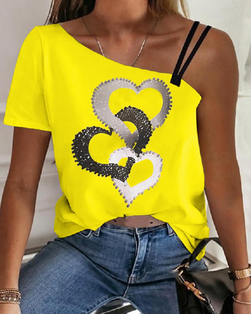 Style:Casual,Chic Type:Tee Material:97%Polyester,3%Spandex Neckline:Asymmetrical Neck Sleeve Style:Short Sleeve Length:Regular Pattern Type:Heart Decoration:Others Fit Type:Regular Occasion:Daily Package Include:1*T-Shirt Fabric Elasticity:Non-Stretch Sheer:Semi-Sheer Care Instructions:Machine wash or professional dry clean