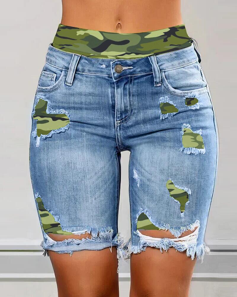 Style:Casual,Denim Type:Denim Shorts Material:97%Polyester,3%Spandex Length:Above Knee Pattern Type:Camouflage Decoration:Washed,Ripped,Pocket Fit Type:Skinny Occasion:Daily Package Include:1*Denim Shorts Fabric Elasticity:Slight Stretch Sheer:No Care Instructions:Machine wash or professional dry clean Waist Line:High Waist