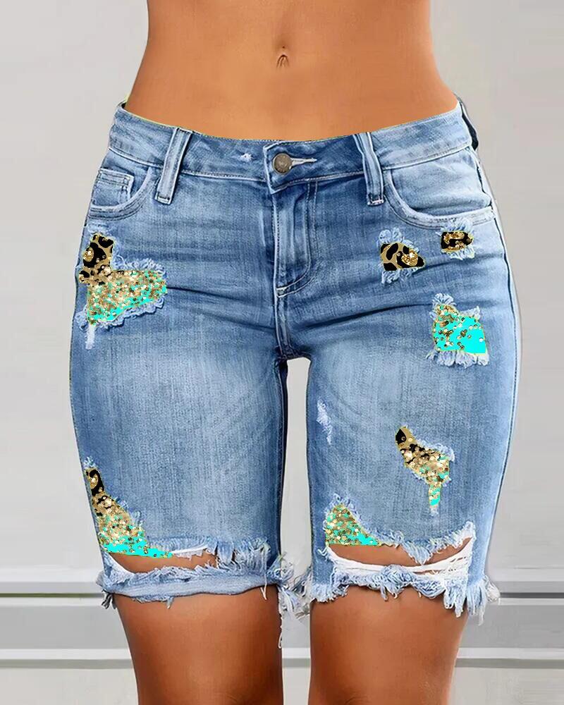 Contrast Leopard Print Ripped Patchwork Raw Hem Denim Shorts