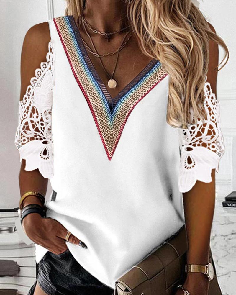 Style:Casual Type:Tee Material:100%Polyester Neckline:Cold Shoulder Sleeve Style:Three Quarters Length:Regular Pattern Type:Contrast Paneled Decoration:Contrast Lace Fit Type:Regular Occasion:Daily Package Include:1*Top Fabric Elasticity:Slight Stretch Sheer:No Care Instructions:Machine wash or professional dry clean