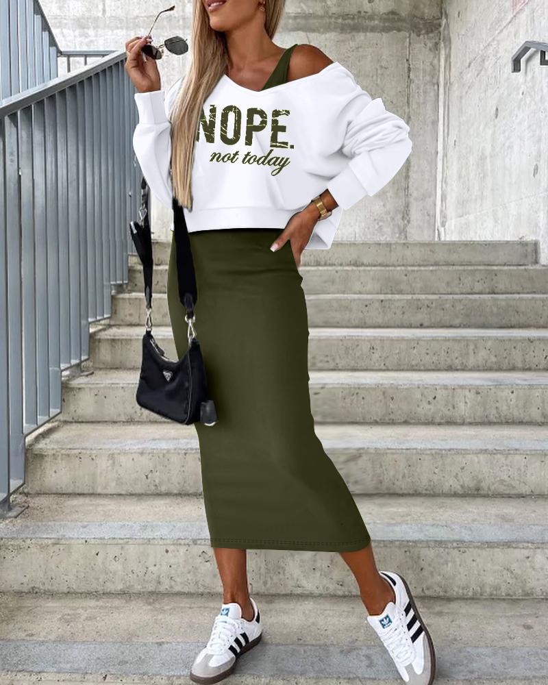 Style:Casual,Chic Type:Suit Set Material:95%Polyester,5%Elastane Neckline:V-Neck Sleeve Style:Sleeveless Length:Mid-Calf Pattern Type:Slogan Decoration:Others Fit Type:Regular Occasion:Daily Package Include:1*Dress & Top Set Fabric Elasticity:Medium Stretch Sheer:No Care Instructions:Machine wash or professional dry clean