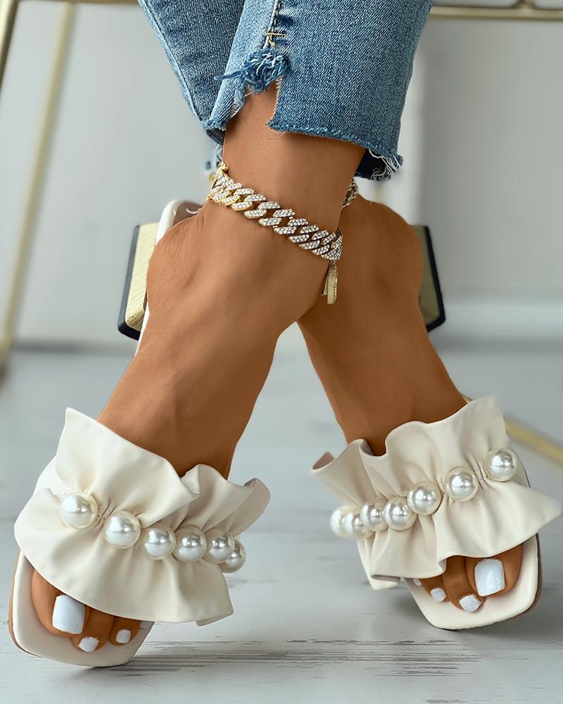 Style:Chic Type:Slippers Material:PU Pattern Type:Plain Decoration:Beaded,Ruched Occasion:Daily Toe:Square Toe Heel Height:Low Heel Package Include:1*Slippers