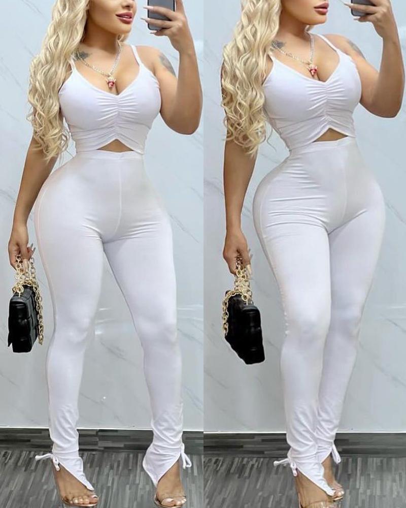 Style:Sexy Type:Pants Sets Material:Polyester Neckline:V-Neck Sleeve Style:Spaghetti Strap Length:Long Pattern Type:Plain Decoration:Tied Detail,Ruched Fit Type:Skinny Occasion:Daily Package Include:1*Pants Set
